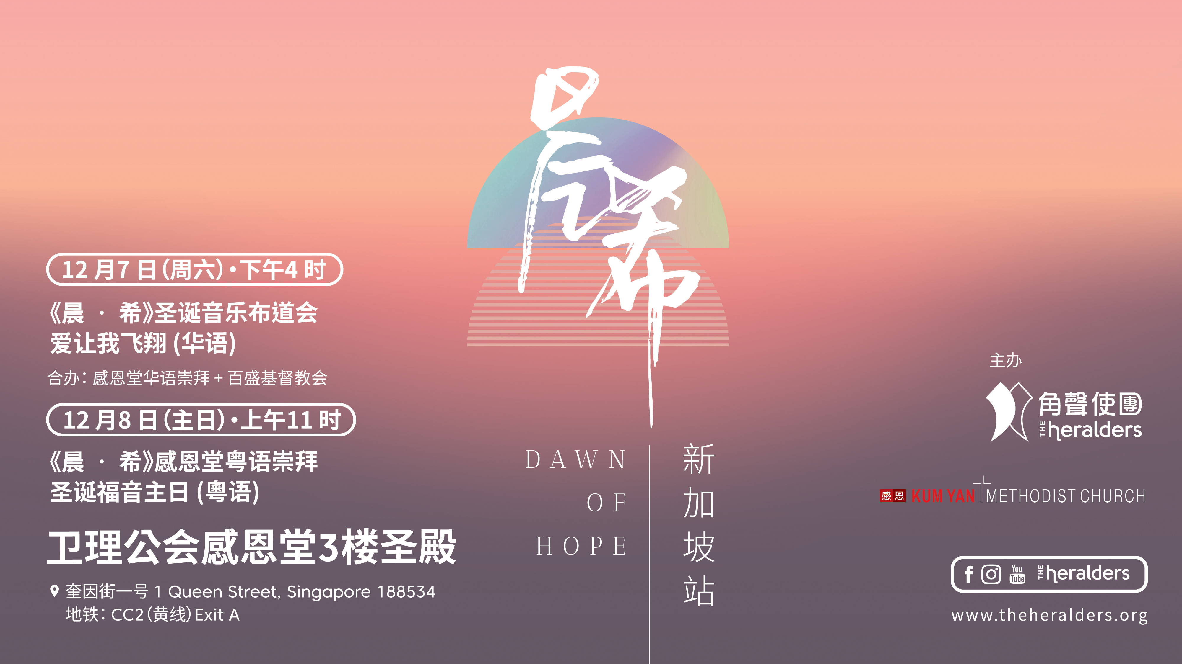 《晨·希》圣诞音乐布道会 – 爱让我飞翔(华语) 圣诞福音聚会 – 主题:晨希 讲员:李伟强牧师 日期/时间: 12月7日(周六)/下午4时 地点:3楼圣殿 + Add to Google Calendar + iCal / Outlook export Date Dec 07 2024 Expired! Time 4:00 pm - 6:00 pm Location Kum Yan Methodist Church Category Church-wide 华语 Mandarin Organizer Organizer Name Share this event VIEW ALL EVENTS